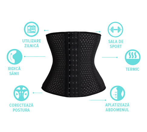 Corsetul este fabricat din materiale elastice, ceea ce permite să vă desfășurați activitățile zilnice cât și programul de sport fără dificultate și fără restricții: grad ridicat de compresie, centură verticală cu trei rânduri de capse, nouă tije metalice foarte rezistente, captuseala de bumbac ce face purtarea corsetului confortabilă.